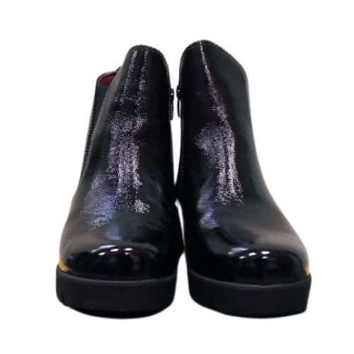 Chic Εμφάνιση με την Υπογραφή της Softies Τα μποτάκια Softies 7222 σε μαύρο λουστρίνι είναι η ιδανική επιλογή για τη γυναίκα που θέλει να προσθέσει μια πινελιά πολυτέλειας στο καθημερινό της ντύσιμο. Η γυαλιστερή υφή του patent leather (λουστρίνι) αναβαθμίζει αισθητικά το παπούτσι, καθιστώντας το κατάλληλο όχι μόνο για το γραφείο αλλά και για τις απογευματινές ή βραδινές σας εξόδους.