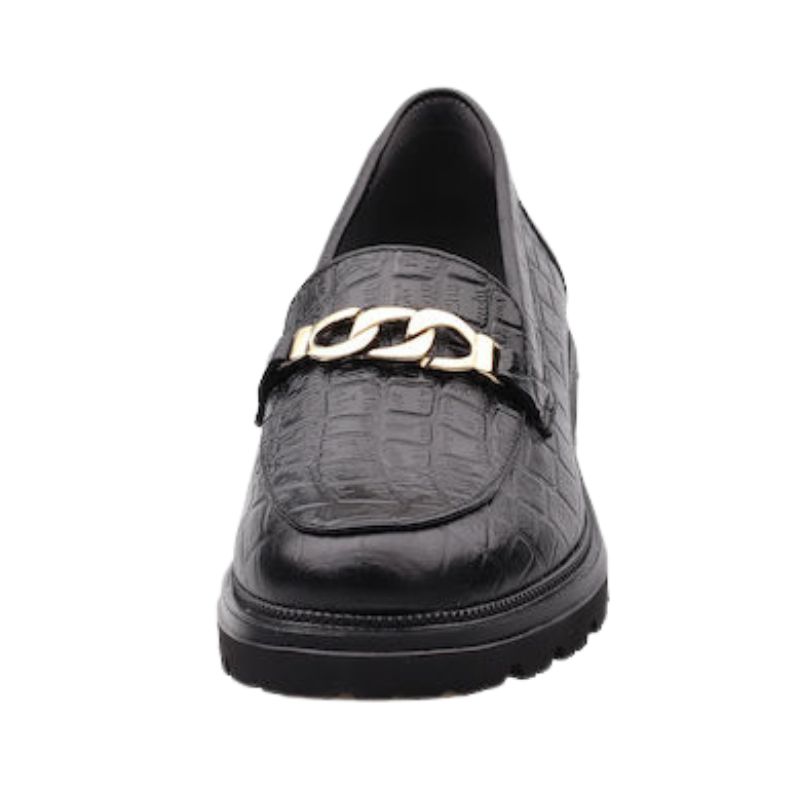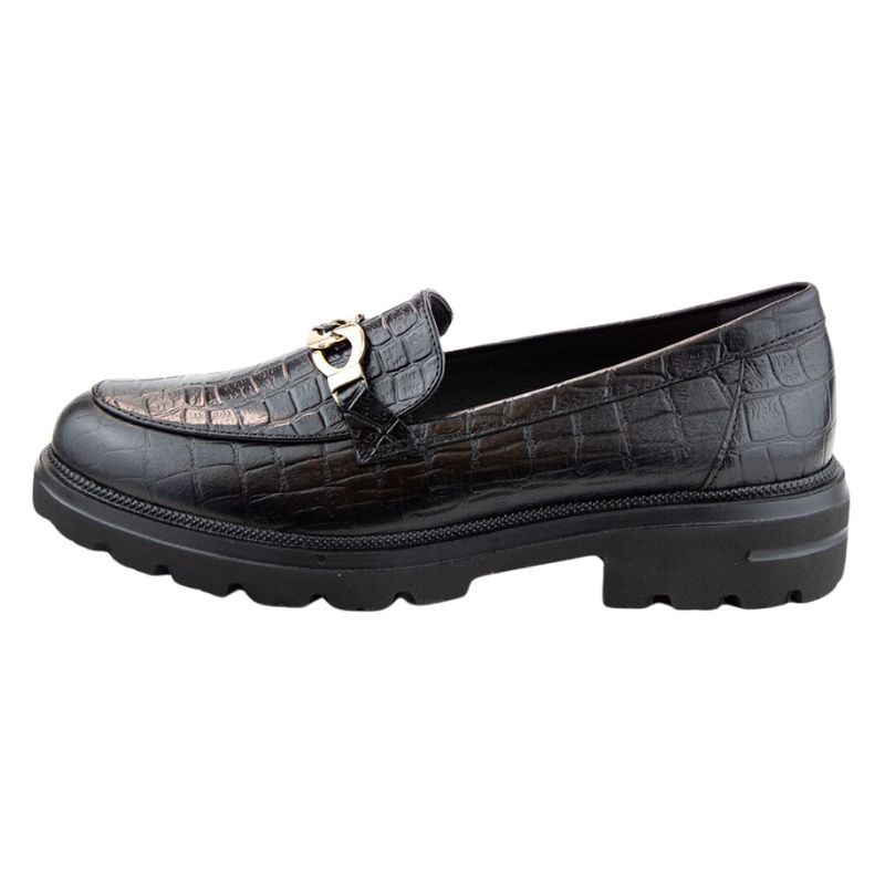 Γυναικεία μοκασίνια σε κλασική υπέροχη γραμμή. Σε μαύρο χρώμα με χρυσή διακοσμητική αλυσίδα θα σας εντυπωσιάσει με την άνεση και την κομψότητά του. Είναι το ιδανικό υπόδημα για τις γυναίκες που ψάχνουν μια πινελιά για να τονίσουν την αυτοπεποίθησή τους. Από τότε που εμφανίστηκε το μοκασίνι έχει γίνει ένα αληθινό fashion must-have. Με δερμάτινο πάτο για απίστευτη άνεση κατά το βάδισμα και αντιολισθητική σόλα με χαμηλό τετράγωνο τακούνι για σταθερό πάτημα.