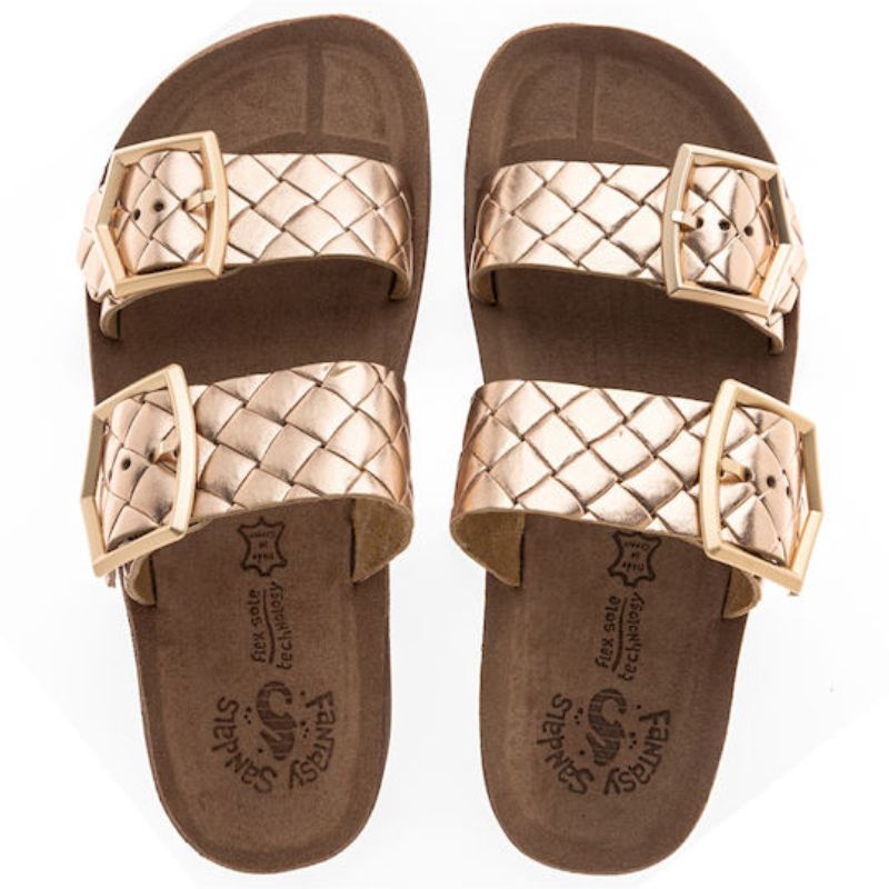 Χειροποίητα γυναικεία σανδάλια, της εταιρίας Fantasy Sandals. Είναι κατασκευασμένα από δέρμα, ένα υλικό που αναπνέει βοηθώντας στην αποφυγή δυσάρεστων οσμών, ενώ παράλληλα καθαρίζεται εύκολα. Προσαρμόζονται στη φόρμα του ποδιού παρέχοντας επιπλέον άνεση. Διαθέτουν ανατομικό σχεδιασμό για άνετο βάδισμα ακόμα και στις πιο απαιτητικές μέρες.